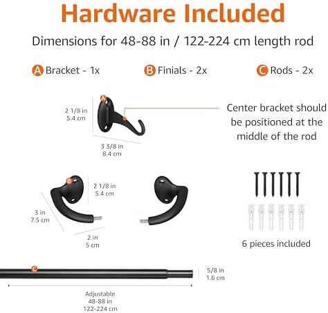 Adjustable length from 48 – 88 inches end-to-end, excluding finials; 20 – 40 inches including wraparound ends; wall mount hardware and instructions included for easy install
