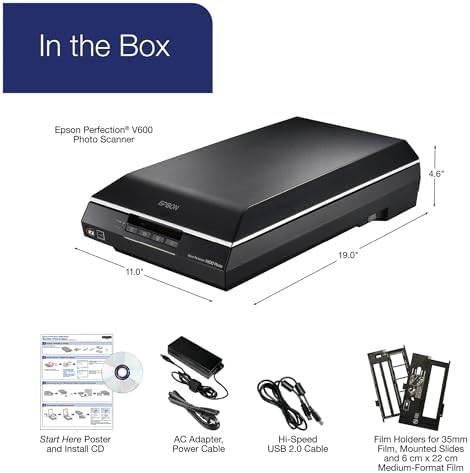 The Epson Perfection V600 Photo delivers outstanding quality scans from photos, film, slides and everyday documents. With 6400 x 9600 dpi resolution, this high performance scanner ensures precision film scanning for sharp, vivid reproductions up to 17″ x 22″. Featuring Digital ICE for both film and prints, one touch color restoration and ArcSoft PhotoStudio, this scanner provides a complete photo restoration solution. Use the built in Transparency Unit to scan slides, negatives and medium format panoramic film up to 6 x 22 cm. The V600 Photo scans everything from invoices and receipts to photos and 3D objects. And, with the included Optical Character Recognition (OCR) software, you can easily convert scanned documents into editable text. Use the scanner’s four customizable buttons to instantly scan, copy, scan to email and create PDFs. The V600 Photo also features Epson’s exclusive ReadyScan LED technology for increased productivity and energy efficiency. Minimum System Requirements: Windows 8, 8.1, Windows 7, Windows Vista, Windows XP, Windows XP Professional x64 Edition, Mac OS X 10.6.x, 10.7.x, 10.8.x, 10.10.x.
