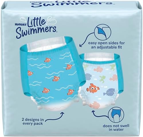 Let your baby make a splash with Huggies Little Swimmers swim diapers! Huggies Little Swimmers water diapers are made with unique materials that won’t swell in water like regular baby diapers and deliver a comfortable fit, wet or dry. The Double Leak Guards of these disposable swim diapers fit snugly around your baby’s legs to help contain messes and offer secure protection in the water. These Huggies diapers for swimming are designed to fit like swimwear and feature easy open, refastenable sides for an adjustable fit and quick diaper changes, whether you’re at the pool or on the beach. The soft, stretchy waistband also makes these baby swim pants comfortable for your baby. These swimming diapers are also made with no harsh ingredients and are free of fragrances, lotions, elemental chlorine bleaching and natural rubber latex. Each pack features two Disney·Pixar Finding Nemo designs your child will love. Perfect for the pool, beach, splash park and more! Huggies Little Swimmers are available in sizes 3 Small (16-26 lbs), 4 Medium (24-34 lbs) and 5-6 Large (32+ lbs).