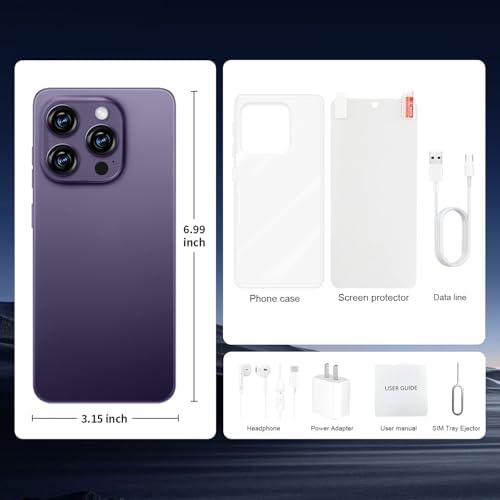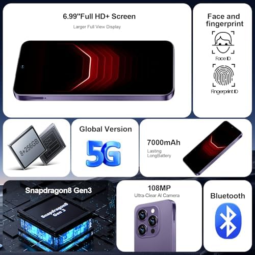 I16 ProMax Smartphone Unlocked Cell Phone, 6.99“ HD Screen 5G Phone, 8+256GB phone unlocked, 7000mAh, 68+108MP Zoom Camera, Fingerprint Button Unlock-and take photos,Dual SIM, Face ID (Deep Purple)