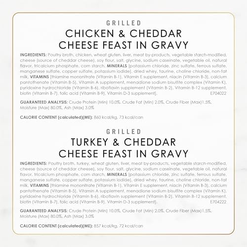 An irresistible, gravy-enhanced Fancy Feast wet cat food grilled chicken, turkey or whitefish taste experience featuring an enticing aroma and a cat-pleasing cheddar flavor
