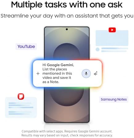 ¹Compatible with select apps. Requires Google Gemini account. Results may vary based on input; check responses for accuracy. ²Displays daily select information from select apps (some apps may require internet connection). ³Compatible with common video formats accessible in Gallery; helps minimize six sounds (Voice/speech, Music, Noise, Crowd, Nature, Wind). Utilizes AI; results vary. ⁴As compared to Galaxy S24 Ultra. ⁵Requires screen resolution setting to QHD+. ⁶Galaxy AI features track data and require a compatible Galaxy wearable device (sold separately), Samsung Health app and Samsung account. ⁹Galaxy AI features track data and require a compatible Galaxy wearable device (sold separately), Samsung Health app and Samsung account. ¹⁰Galaxy AI features by Samsung are free through 2025 and require Samsung account login.