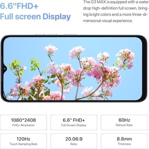 6.6-inch FHD Display mobile phone : Umidigi G3 MAX cell phones With a 6.6-inch Full HD+ display offers a truly immersive viewing experience. 2408*1080 resolution allows for sharp and detailed images, 20.06:9 aspect ratio offers a wider display area for a more cinematic viewing experience. 120Hz Touch Sampling Rate making the touch response of the display more fluid and responsive. It is especially useful for mobile gamers who require precise and accurate touch input for games.